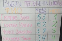 По итогам голосования президентом школьного ученического самоуправления большинством голосов была избрана Ерёменко Злата-ученица 9"А"класса.29 нчы октябрь көнне мәктәп укучылары үзидарәсе Президентын сайлау булды. Сайлаулар бик актив узды. Сайлау комиссиясе тарафыннан сайлаулар процедурасында хокук бозулар ачыкланмады. 6 нчы сыйныф укучылары составында сайлау комиссиясе Цыпленкова П., Бендель В., Драничникова Я. тавыш бирү бюллетеньнәрен санады. Тавыш бирү нәтиҗәләре буенча мәктәп укучылары үзидарәсе президенты итеп күпчелек тавыш белән 9 нчы А сыйныфы укучысы Еременко Злата сайланды.
