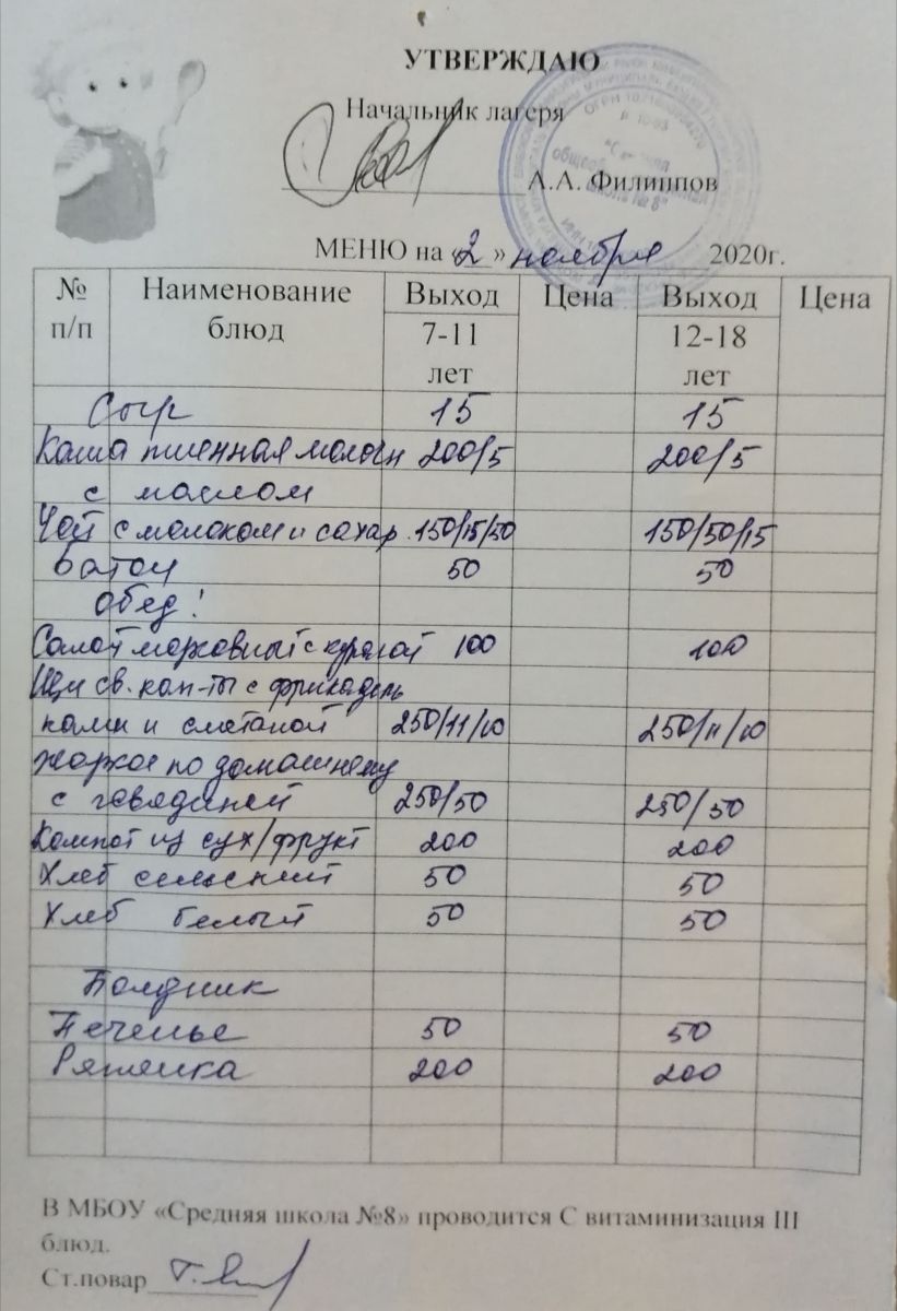 Меню пришкольного лагеря. Мәктәп яны лагере өчен меню 02.11.2020