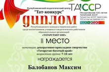 Балобанов Максим, учащийся 2в класса стал победителем 2 степени в Республиканском конкурсе творческих работ "Татарстану - 100!" в номинации "Декоративно-прикладное творчество. Татарстан - богатый край!". Поздравляем Максима и руководителя проекта Мазняк Л.И.!