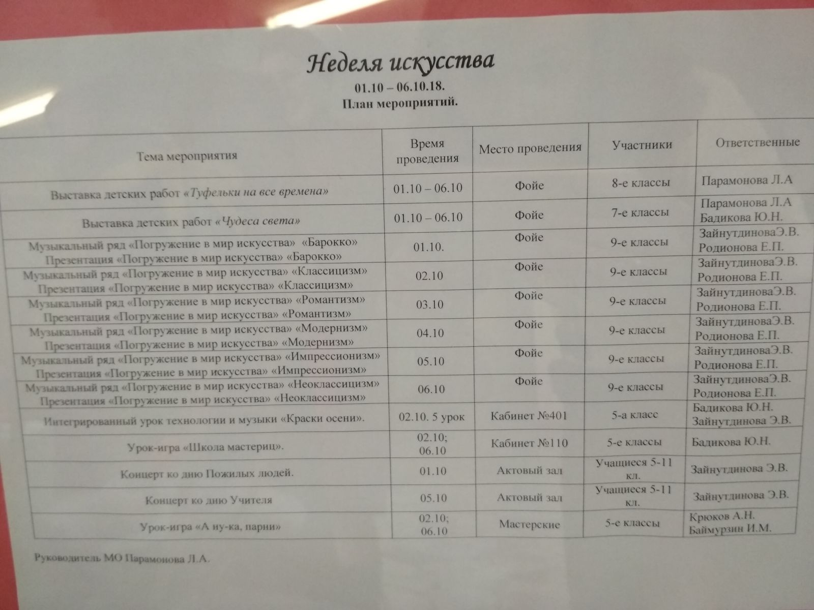 C 1-6 октября в школе проходит ежегодная "Неделя искусства". Учителя технологии Парамонова Л.А, Бадикова Ю.Н., Крюков А.Н., Баймурзин И.М. организовали выставку "Туфельки на все времена", "Чудеса света", игру "А ну-ка, парни". Также будут проведены открытые уроки по технологии и музыке "Краски осени", урок-игра "Школа мастериц". Родионова Е.П. и Зайнутдинова Э.В. представляют видеоряд "Погрудежение в мир искусства" с показом репродукций картин выдающихся художников и музыкальных произведения по эпохам: "Барокко", "Классицизм", "Романтизм", "Модернизм", Импрессионизм", Неоклассицизм".1-6 октябрь көннәрендә һәр ел саен үткәрелә торган Сәнгать атнасы башланды. Технология укытучылары Л.А.Парамонова, Ю.Н Бадикова, И.М.Баймурзин, А.Н.Крюков бу атналык кысаларында төрле бәйгеләр, кызыклы чаралар әзерләделәр. Мәктәптә бу көннәрдә "Могъҗизалар иле", "Һәр көн гә туфлилар" дигән күргәзмзлзр оештырылды. Родиова Е.П., Зәйнетдинова Э.В. оештырган виделроликлар балалар күңеленә бик хуш килде. Атнаның һәр көне берәр юнәлешне чагылдырып бара. -