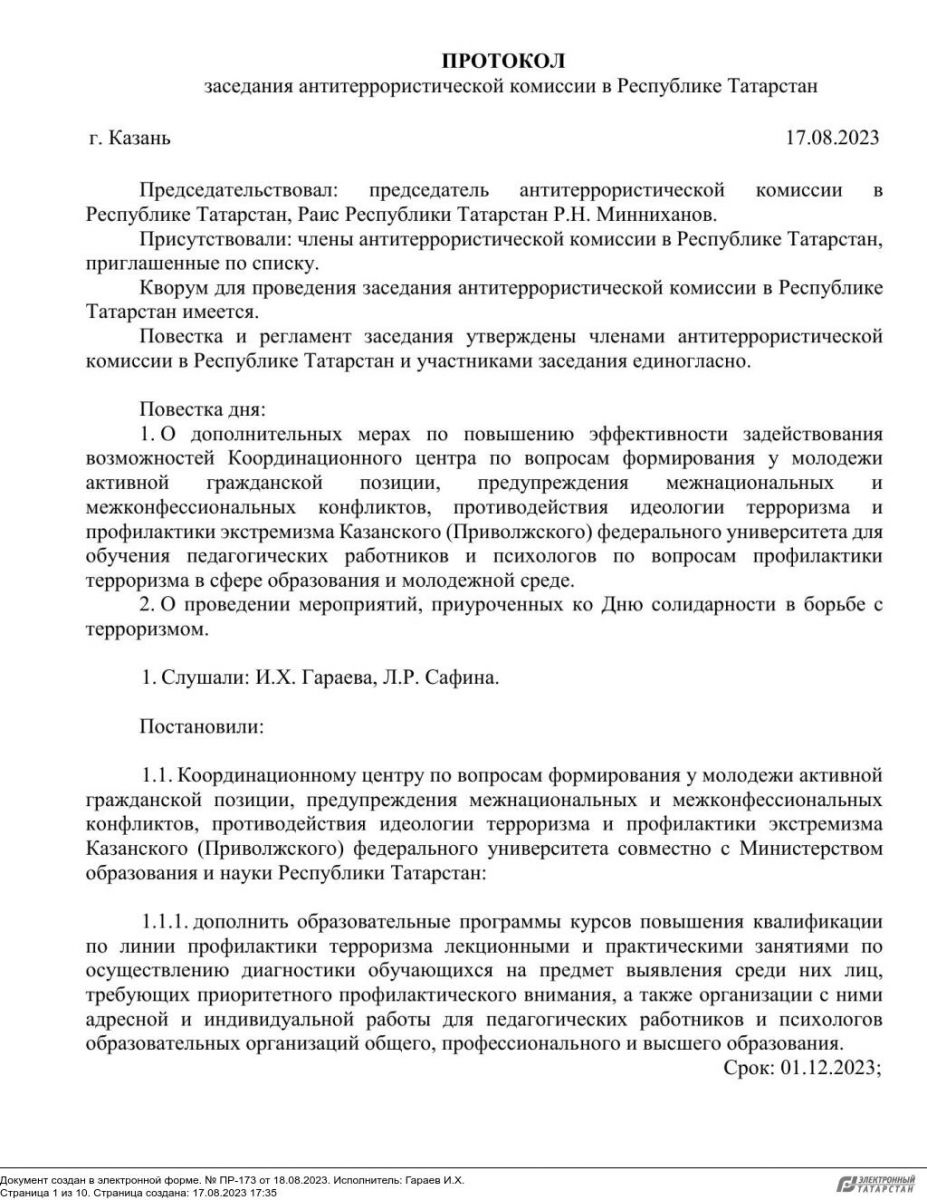 Протокол заседания антитеррористической комиссии в РТ от 17.08.2023