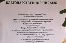 Национальный парк «Нижняя Кама» выражает благодарность МБОУ «Танаевская средняя школа» ЕМР РТ за плодотворное сотрудничество в деле экологического просвещения подрастающего поколения «Вы вносите неоценимый вклад в популяризацию идей заповедного дела и сохранение природных комплексов Республики Татарстан».
