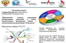 Сегодня в нашей школе прошел муниципальный семинар «Практические аспекты применения интерактивных технологий в учебно-воспитательном пространстве школы с использованием ресурсов центра «Точка роста». На открытых занятиях и мастер-классах учителя продемонстрировали навыки практического применения интерактивных технологий. Для гостей была организована выставка проектных работ учащихся.