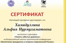 Хәмидуллина А. Н. "хәзерге Россия гражданины һәм патриоты тәрбияләү" Бөтенроссия фәнни-гамәли конференциясендә "онытылган авыллар истәлеге"дигән доклад белән чыгыш ясады. Шулай тотарга!