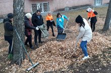 Средник по уборке прилегаемой территории..туристы за работой ....листва почти вся опала...по приметам как вся листва с берёзы и вишни опадает то выпадет первый снег...