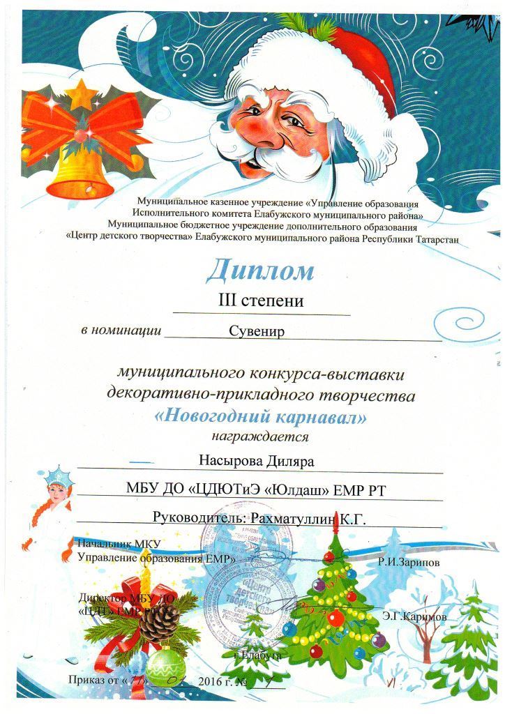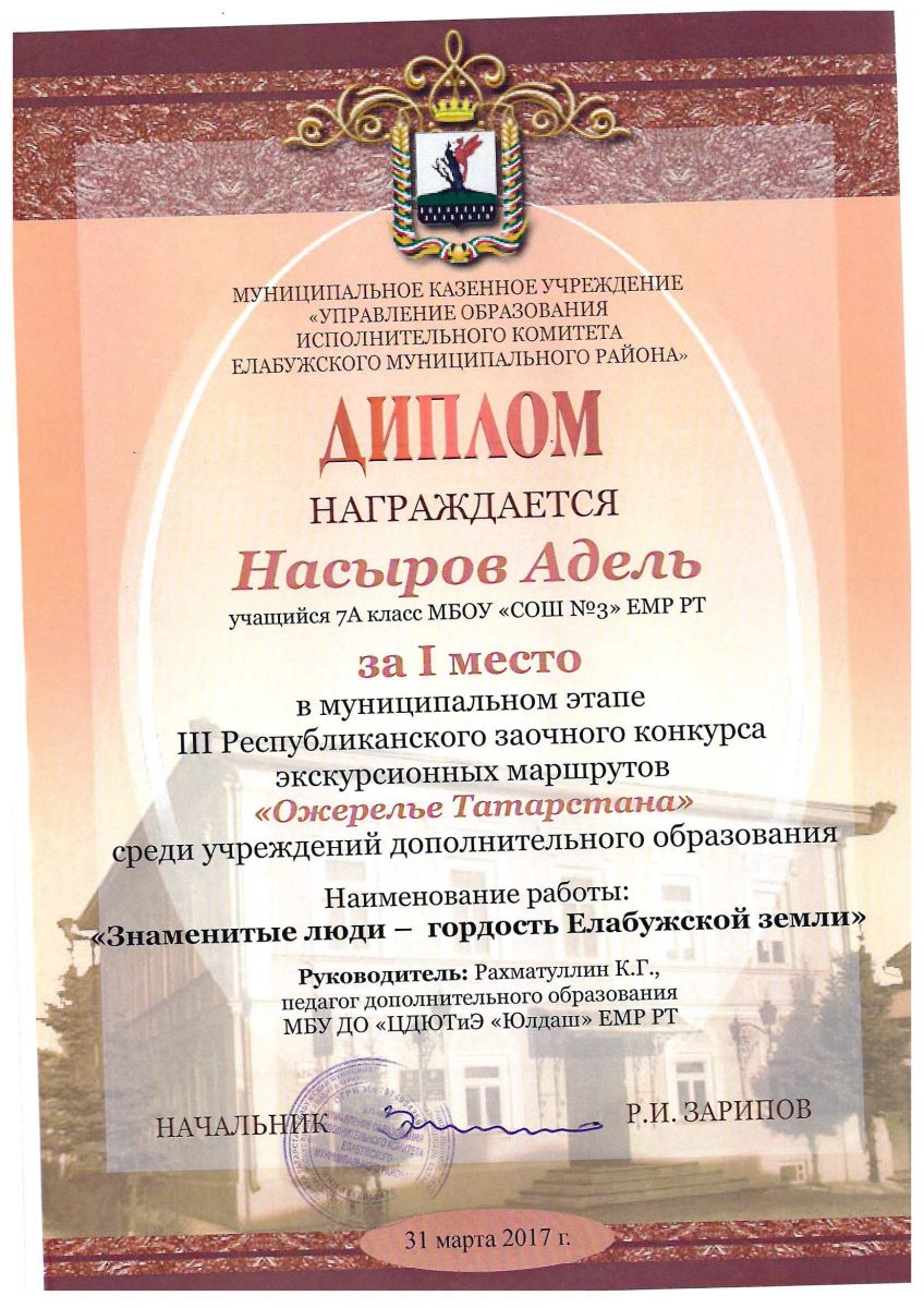 Диплом Насырову Аделю за 1 место в муниципальном этапе 3 Республиканского заочного конкурса Ожерелье Татарстана.jpg
