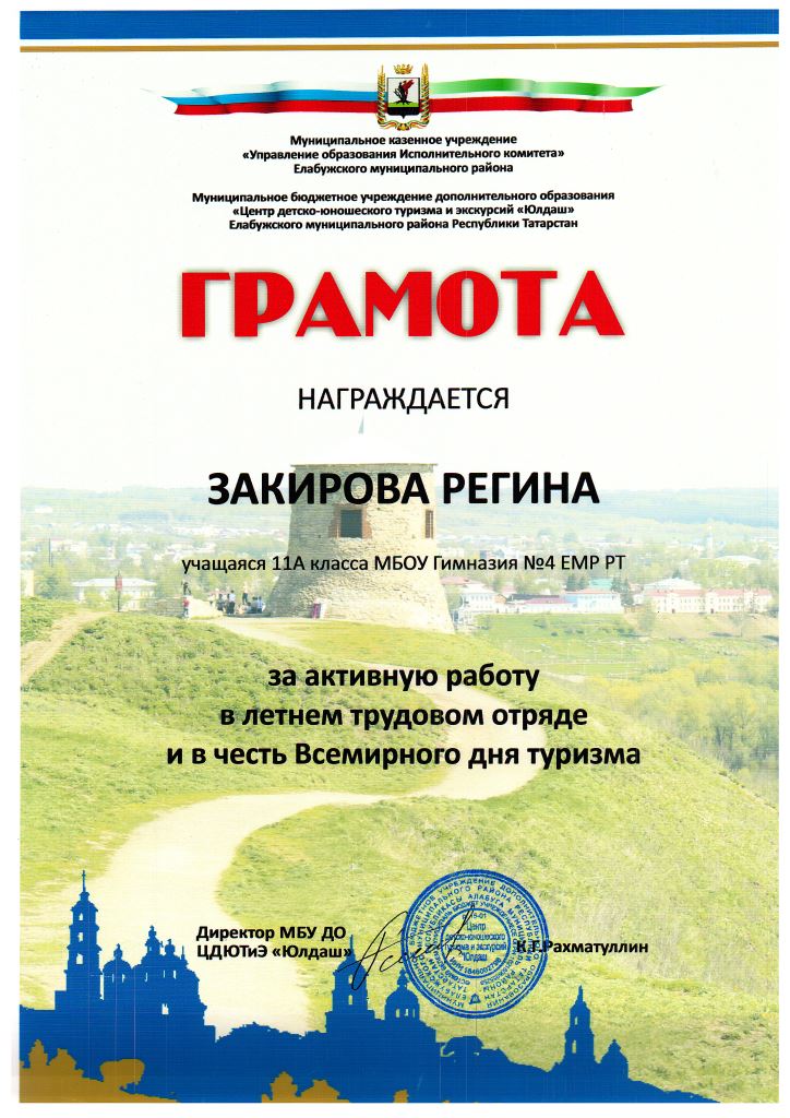 Грамота за активную работу в летнем трудовом отряде . Закирова Регина. Гимназия № 4, 11А.jpg