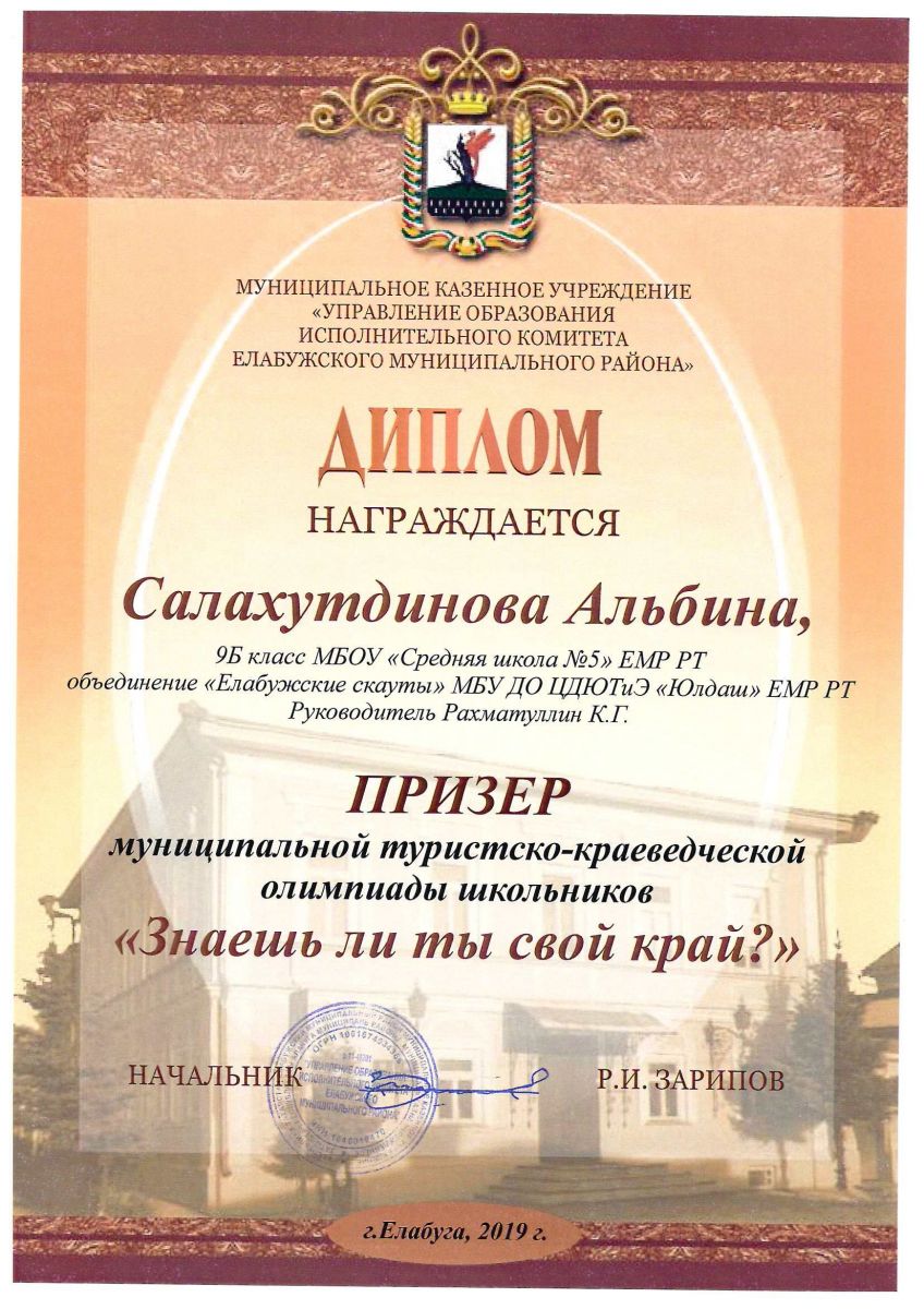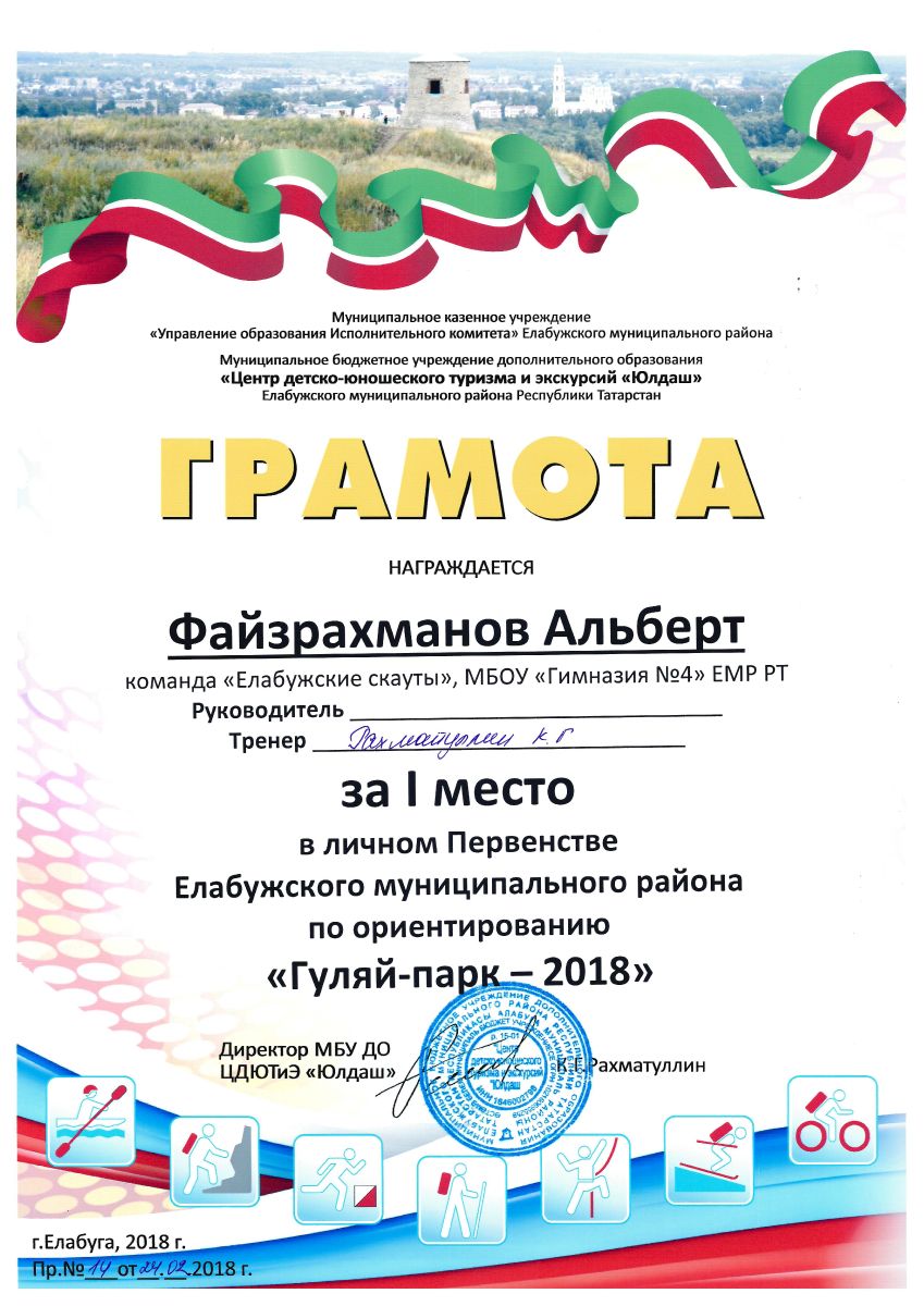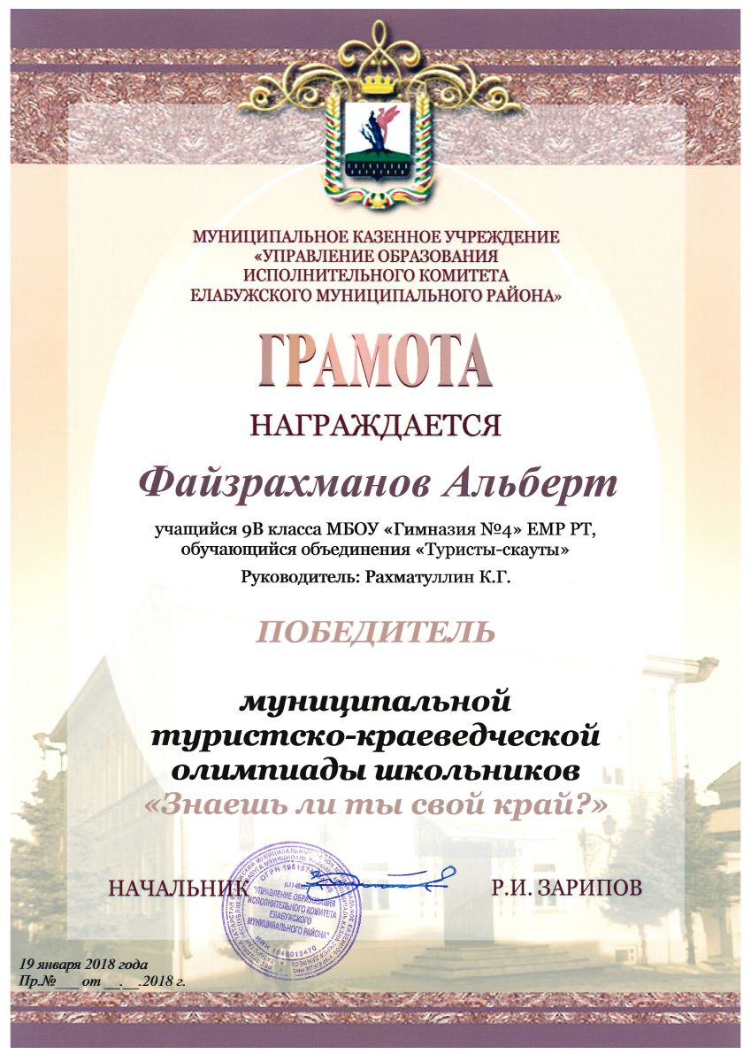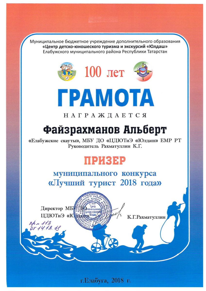 Грамота призера в муниципальном конкурсе "Лучший турист 2018 года" Файзрахманов Альберт.jpg