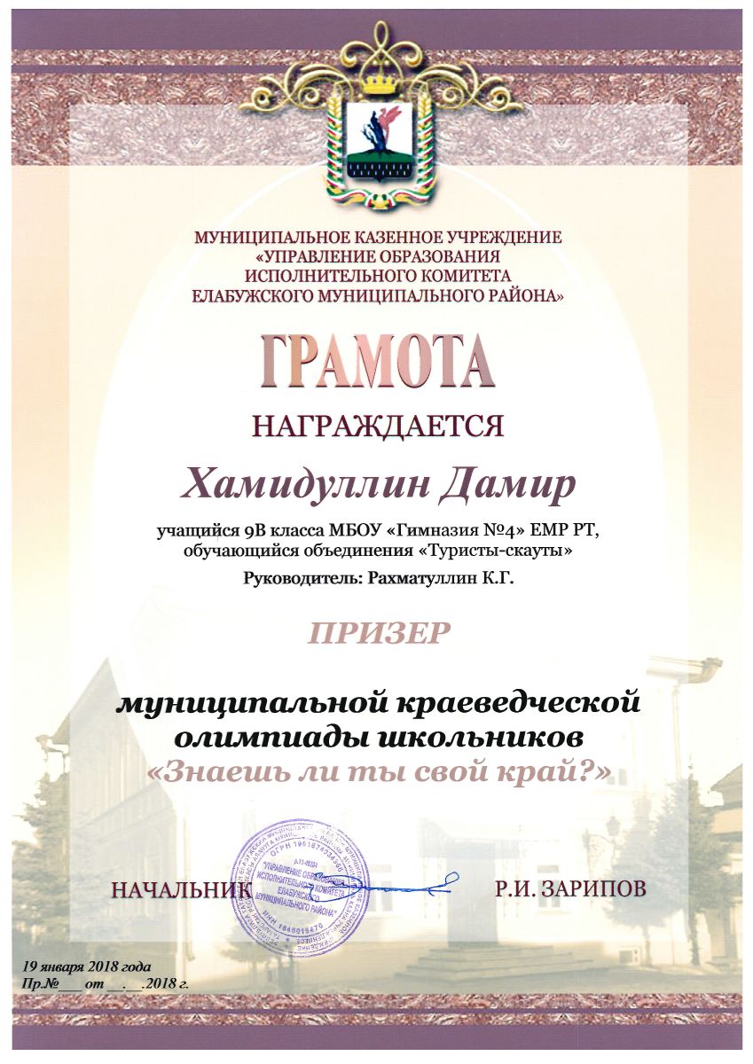 Грамота Призера муниципальной краеведческой олимпиады "Знаешь ли ты свой край?" Хамидуллин Дамир.jpg