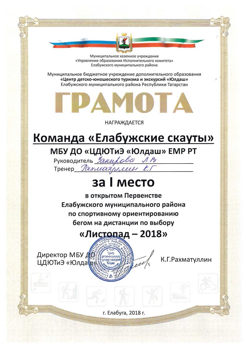 Грамота за 1 место в командном зачете в соревнованиях по СО "Листопад-2018" Елабужские скауты.jpg