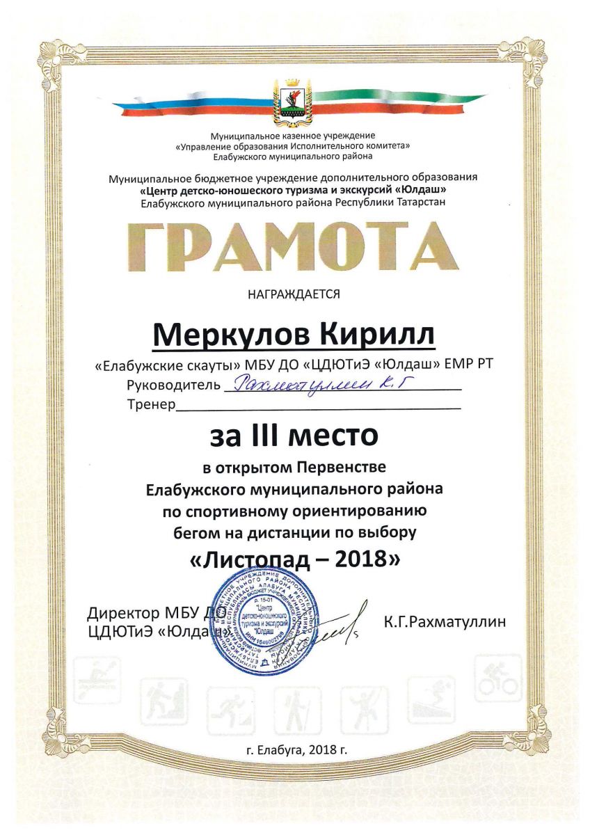 Грамота за 3 место в личном зачете в соревнованиях по СО "Листопад-2018" Меркулов Кирилл.jpg