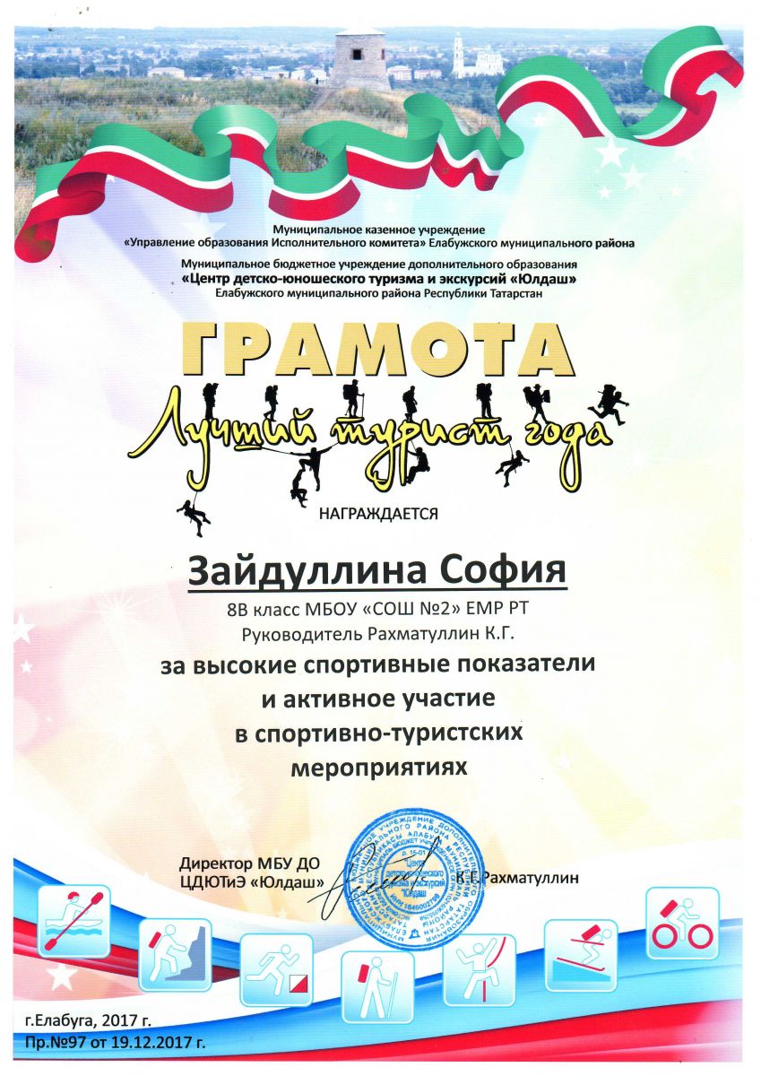 Грамота "Лучший турист 2017 года" Зайдуллина София.jpg