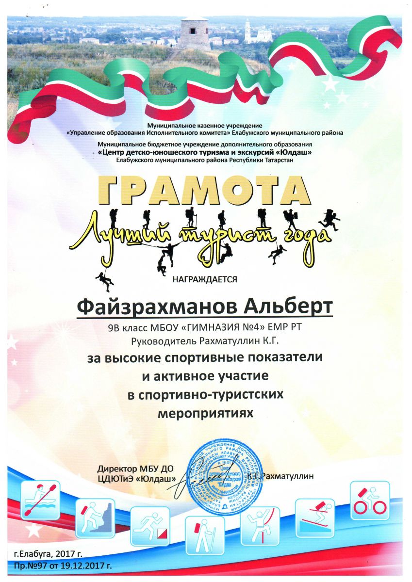 Грамота "Лучший турист 2017 года" Файзрахманов Альберт.jpg