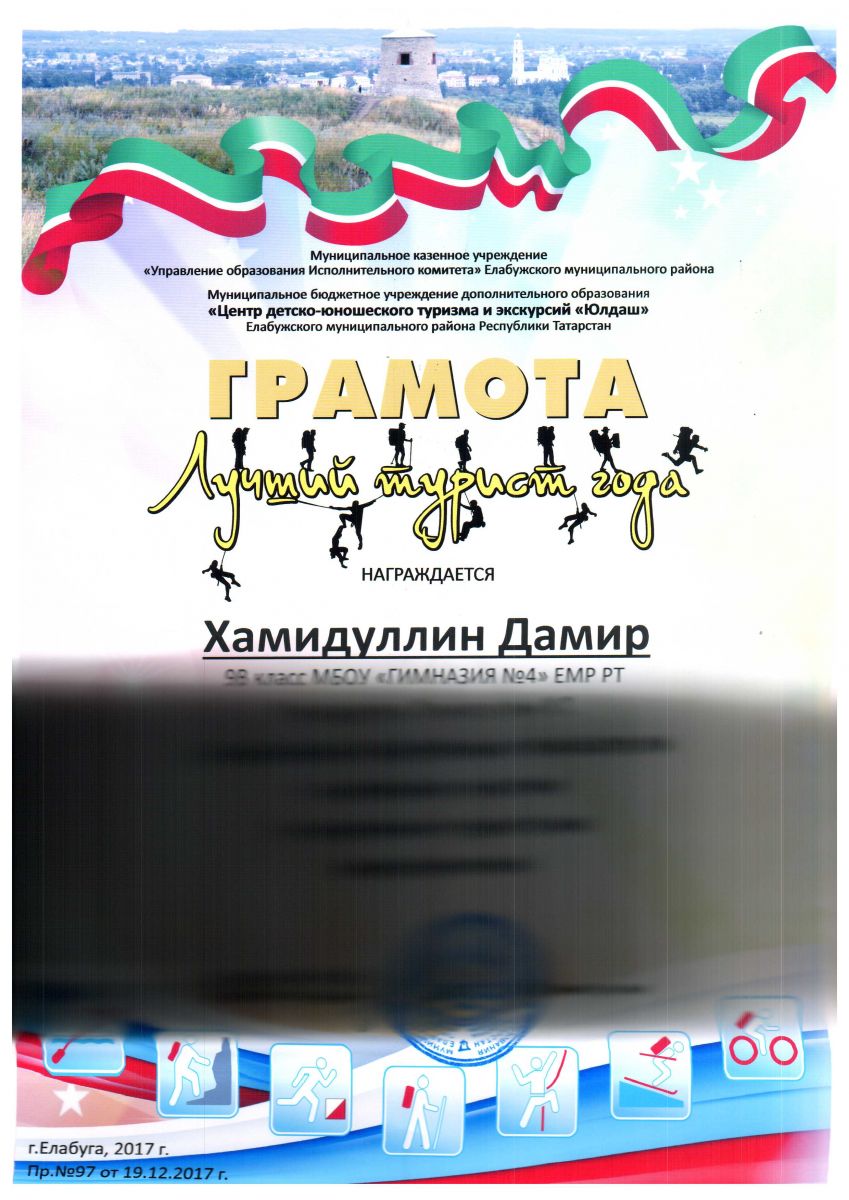 Грамота "Лучший турист 2017 года" Хамидуллин Дамир.jpg