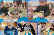 Первая младшая группа. Рисование " Зайка беленький сидит..." Наши самые маленькие продолжают знакомится с необычными способами рисования. Малыши повторили игру "Зайка серенький сидит..." Закрепили свои знания, что зайчик зимой белый.
