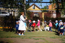 Лето в самом разгаре, в детском саду продолжаются закаливающие процедуры на свежем воздухе, под руководством ст. медсестры Наили Саматовны. Под веселую, энергичную музыку дети выполняют различные упражнения, ходят по закаливающей дорожке.