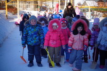 Несмотря на прохладную погоду, детишки выходят гулять. Они играют в подвижные игры, катаются на санках, играют в снежки, копают, строят крепости, гуляют по парку.
