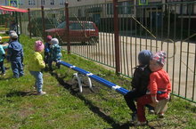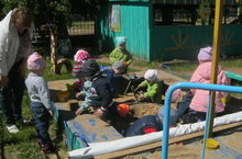 Наконец то появилось солнышко с утра! Малышки знакомятся игровым оборудованием. Вот карусель, на нем можно кататься, но нужно крепко держаться. Воспитатели постепенно формируют у малышей правила безопасности и следят за выполнением этих правил.