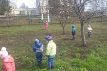 Ясельная группа вышла на весеннюю прогулку в яблоневый сад.