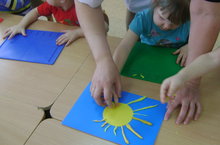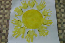 Ясельная группа подарила родителям солнце. Работу сделали при помощи красок и ладошек.