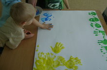 Разновозрастная группа нарисовала на НОД картину "Травка зеленеет, солнышко блестит". при помощи красок и ладошек.