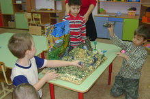 Вместе с воспитателем Глониной Е.А. старшая группа сделала макет поля боя. Дети изучали мастерство солдат. расстановку на поле и играли в "солдатики".