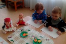 Сегодня наши малыши встречали гостей: куклу Алсу и куклу Катю. Для них они напекли вкусные оладушки.
