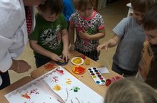 Воспитатель Софьина И.А. и воспитанники средней группы украсили группу картиной, применяя нетрадиционную технику рисования - осенним листком!