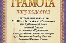Воспитанники старшей и подготовительной группы с руководителями Демидовой Т.Л., Миннуллиной Д.А. поставили сказку на татарском языке "Три сестры" и приняли участие в конкурсе! У нашего театрального коллектива 1 место! Молодцы! Поздравляем!