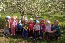 Сегодня воспитанники 1 младшей группы с воспитателем Софьиной И.А. сходили на прогулке в цветущий яблоневый сад на территории детского сада.