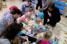 В ясельной группе прошло семейное развлечение "Мама, папа, Я - играем вместе". Пришели на мероприятие мамы, папы, бабули! Все вместе они поиграли, встретили гостей (кошка и мышка) , сделали домик для мышки и танцем порадовали кошку! Вместе дружно оформили плакат и запустили воздушные шарики.