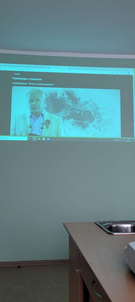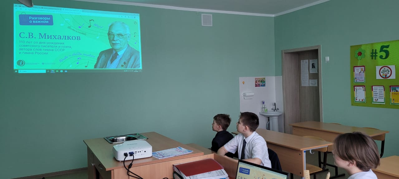 13 марта ,с учащимися 2 и 4 класса , провели Разговор о важном на тему " 110 лет со дня рождения советского писателя и поэта, автора слов гимна СССР и гимна России С.В. Михалкова". Провели беседу, игровые задания, прослушали видеофрагменты, просмотрели презентацию.