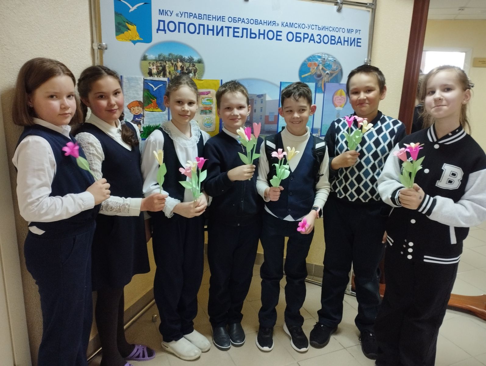 В объединении дополнительного образования «Изобразительное творчество» под руководством педагога Мингазеевой Г. Р. обучающиеся изготовили поделки из цветной бумаги «Весенние крокусы»