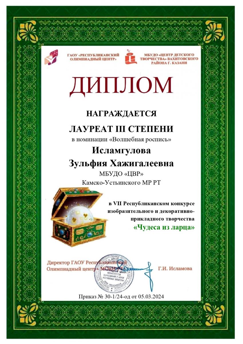 Методист Исламгулова З. Х. награждена дипломом лауреата 3 степени в номинации «Волшебная роспись».