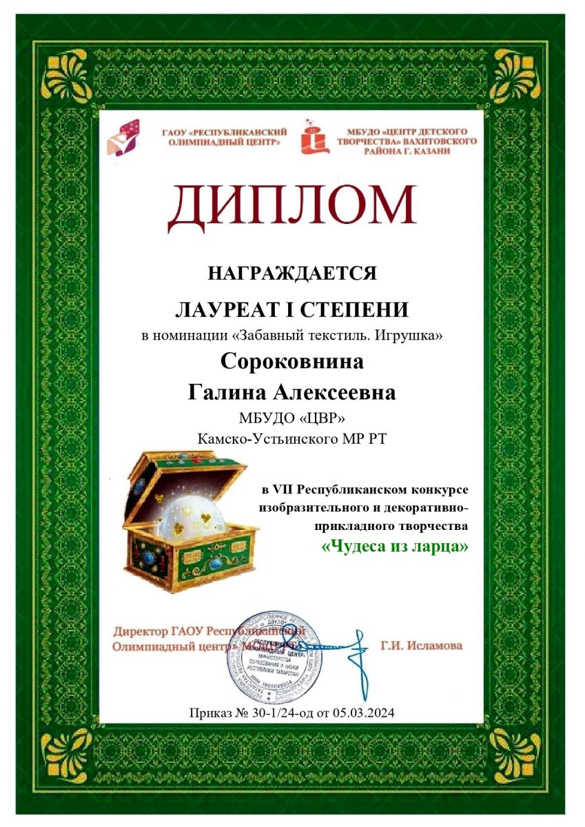 Педагог дополнительного образования МБУДО «Центр внешкольной работы» Сороковнина Г. А. награждена дипломом лауреата 1 степени в номинации «Забавный текстиль. Игрушка.».