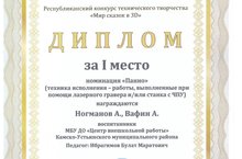 В номинации «Панно» (техника исполнения - работы, выполненные при помощи лазерного гравера и/или станка с ЧПУ) I место заняли Ногманов Адель и Вафин Адель, МБУДО «Центр внешкольной работы» (педагог Ибрагимов Булат Маратович).