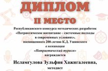 Методист центра внешкольной работы Исламгулова Зульфия Хажигалеевна заняла 2 место в Республиканском конкурсе методических разработок «Патриотическое воспитание – системные подходы в современных условиях», посвященном 200-летию К.Д.Ушинского в номинации «Патриотический туризм».Поздравляем Зульфию Хажигалеевну и желаем дальнейших успехов!