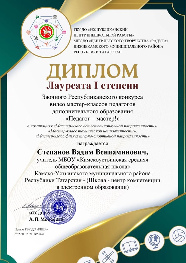 Лауреат 1 степени заочного Республиканского конкурса видео мастер-классов педагогов дополнительного образования «Педагог - мастер!» - Степанов В. В.
