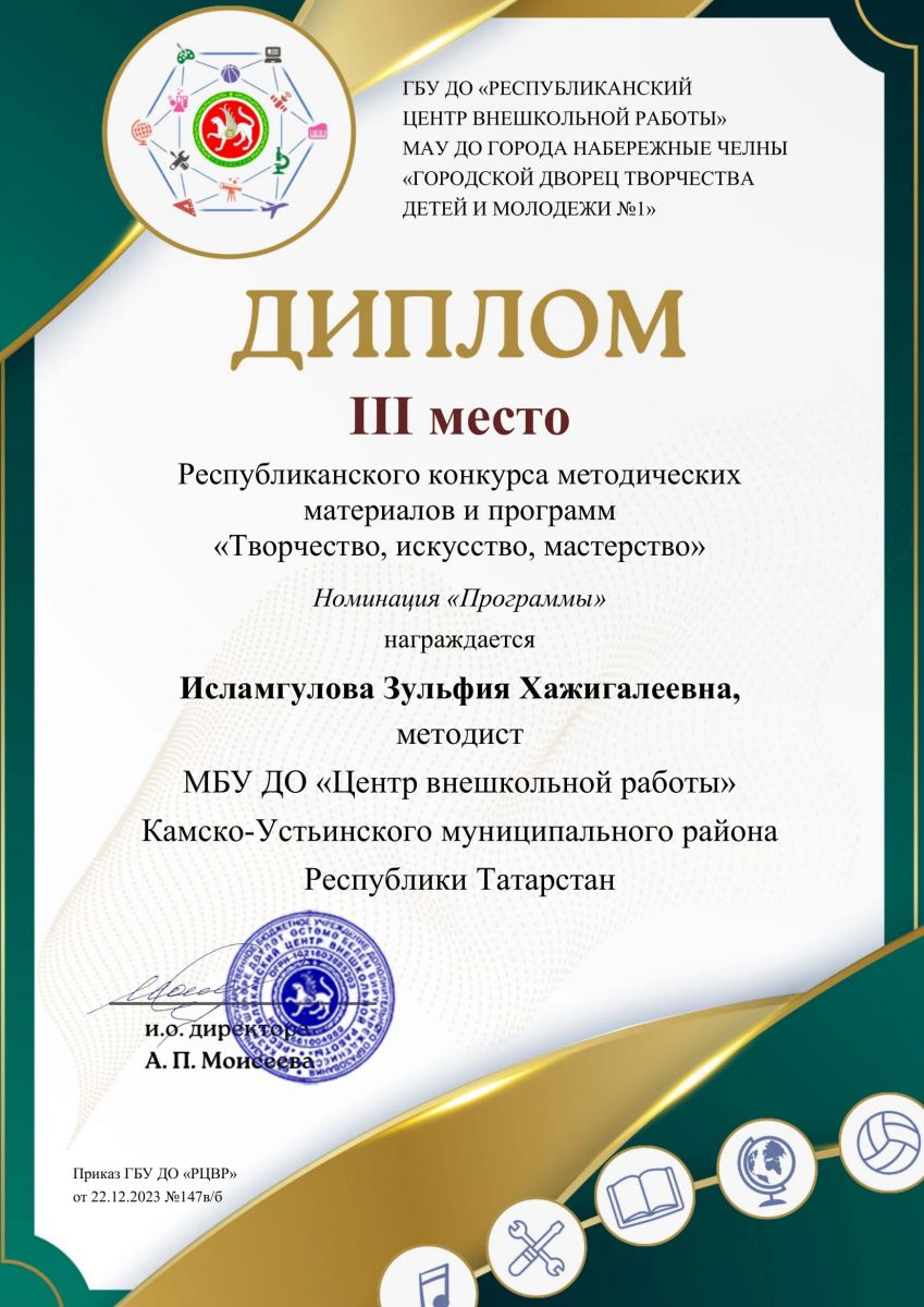 3 место в Республиканском конкурсе методических материалов и программ «Творчество, искусство, мастерство» - Исламгулова З. Х.