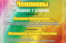 Поздравляем ученицу 5 класса ДМШ Лазареву Аполлинарию (руководитель Мухамадеева З.М.) с победой во Всероссийском экспресс-конкурсе "Чемпионы".