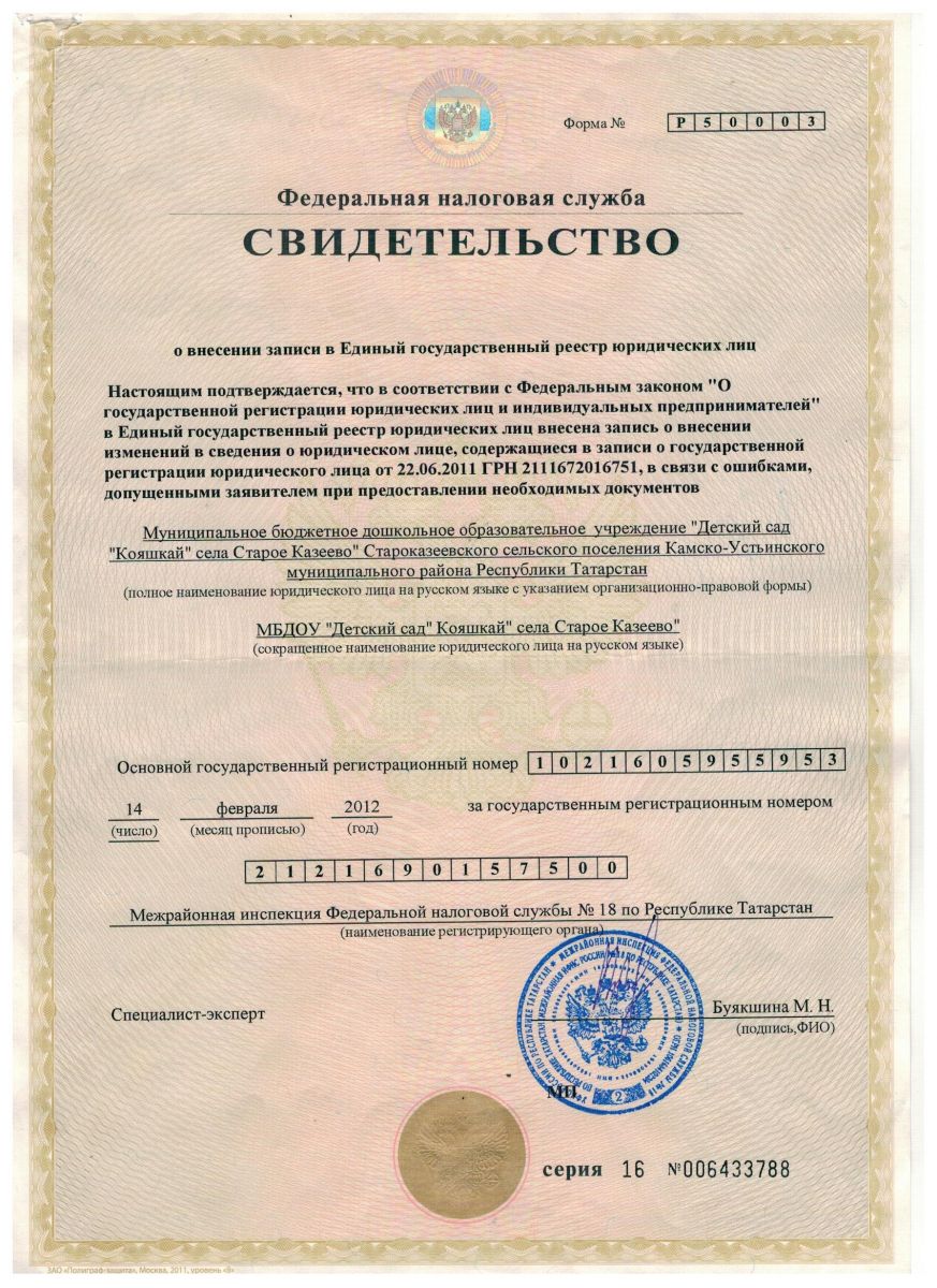 Свидетельство о внесениизаписи в Единый государственный реестр юридических лиц