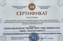 Сертификатом участника зонального этапа республиканского фестиваля-конкурса школьных коллективов на иностранных языках "SCHOOL PERFORMANCES" награжден театральный коллектив "Фантазия" под руководством Хайруллиной Р.Х. Молодцы! Желаем дальнейших успехов!