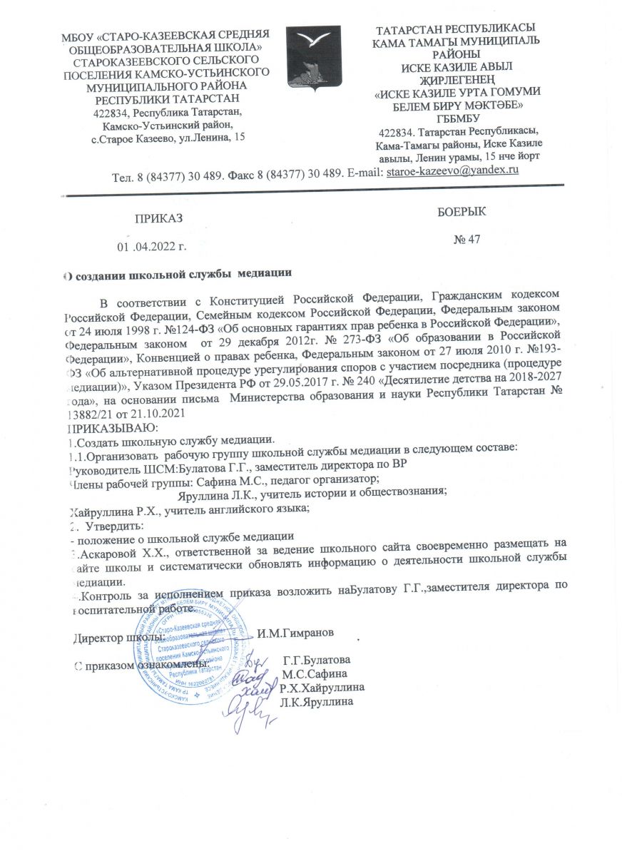 Приказ о создании школьной службы медиации