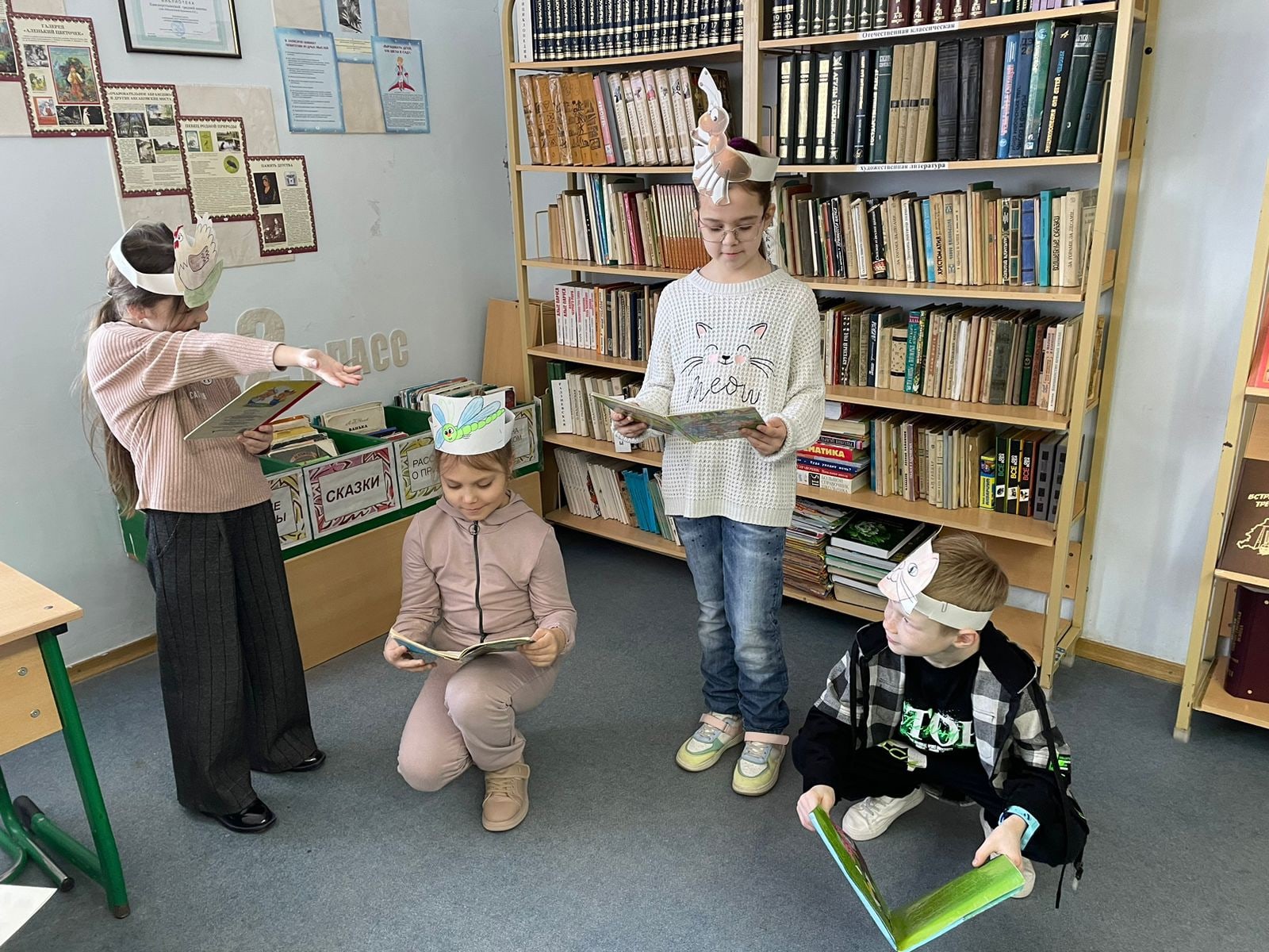 Театральләштерелгән уку:» әкиятче кызда кунакта " (рольләр буенча әкиятләр уку) 2б сыйныф укучылары белән мәктәп китапханәсендә узды (җитәкчесе Ю.Г. Соколов сыйныфы). Балалар кызыксынып табышмакларны чиштеләр, мавыктыргыч әкиятләр укыдылар, төрле әкият геройларын таныдылар. Аннары балалар яраткан персонажларының рәсемнәрен ясадылар, бик тырыштылар, рәсемнәрен җентекләп буядылар.