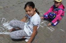 Воспитатели пришкольного лагеря организовали конкурс рисунков на асфальте "Солнечное лето".
