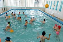 Бүген лагерьга йөрүче балалар бассейнга менде.Тренер белән бергә суда йөзү алымнарын өйрәнделәр.