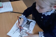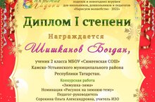 Шишканова Богдана, убучающегося нашей школы, призёра всероссийского конкурса рисунков "Зимушка - зима" (руководитель- Сорокина О.А.)