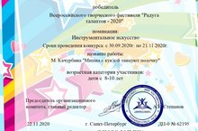 обучающуюся нашей школы,Сорокину У. - лауреата 1 степени Всероссийского творческого фестиваля "Радуга талантов-2020" в номинации "Инструментальное искусство": название работы М.Качурбина "Маша с куклой танцуют полечку", возрастная категория 8-10 лет.
