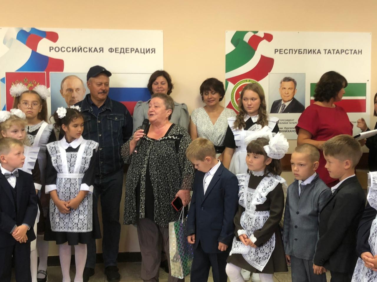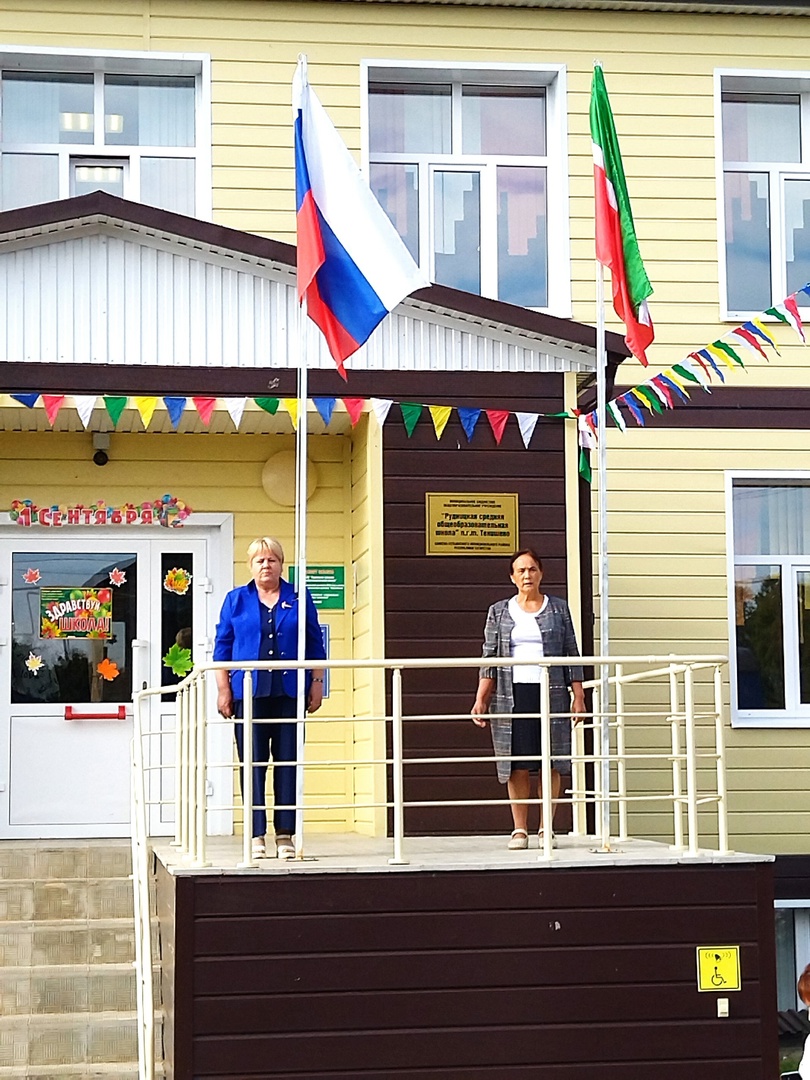 Почётное право поднять флаг Российской Федерации и флаг Республики Татарстан на этой неделе было предоставлено награжденным нагрудным знаком «За заслуги в образовании» учителю русского языка и литературы Валеевой В. И. и учителю родного (татарского) языка Хусаиновой В. Р.