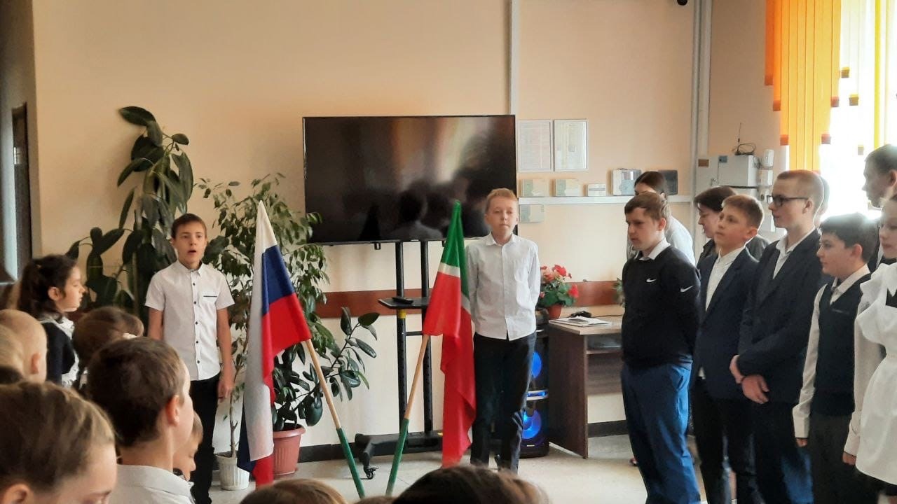 Прекрасное начало новой весенней недели! Торжественная общешкольная линейка. Школа дружно исполняет Гимн РФ и РТ. Почетное право вынести флаг Российской Федерации и флаг Республики Татарстан предоставлено победителям конкурса "Безопасное колесо" Князеву Никите и Джепову Богдану.